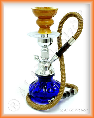 Vodní dýmka Pumpkin v modro-hnědém provedení. Celková výška vodní dýmky 27cm, objem vázy 350ml, délka hadice 100cm. Součásti vodní dýmky : skleněná váza, tělo vodní dýmky, šlahoun, korunka, těsnění pod korunku a šlahoun, kleštičky.